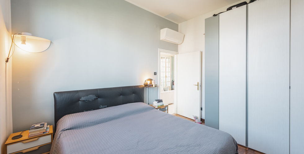 La zona notte, ben separata, ha due camere da letto luminose e un bagno finestrato in stile moderno.