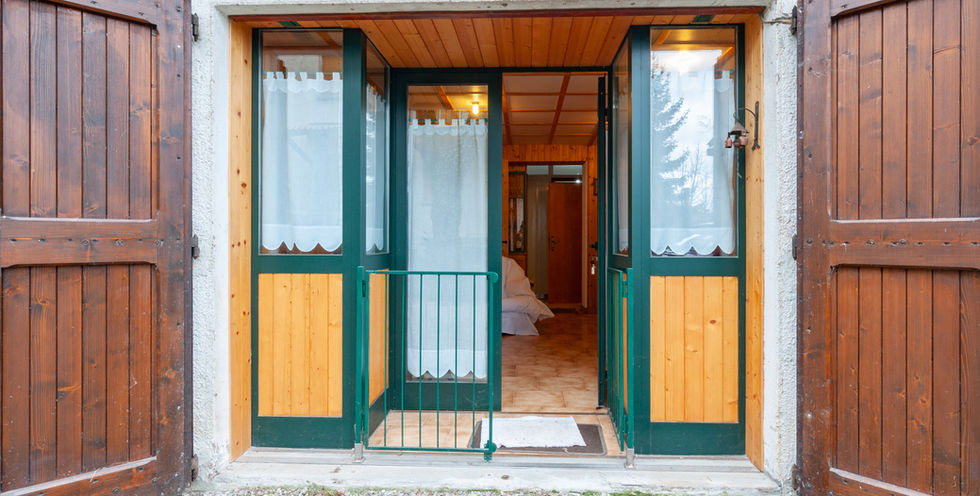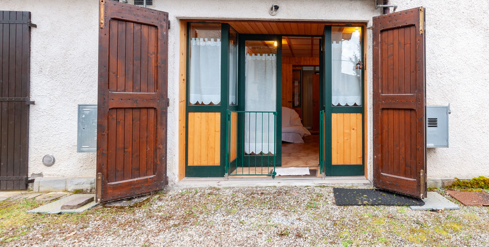 Ha una unica grande porta finestra di accesso nuova e gli scuri sono in legno.